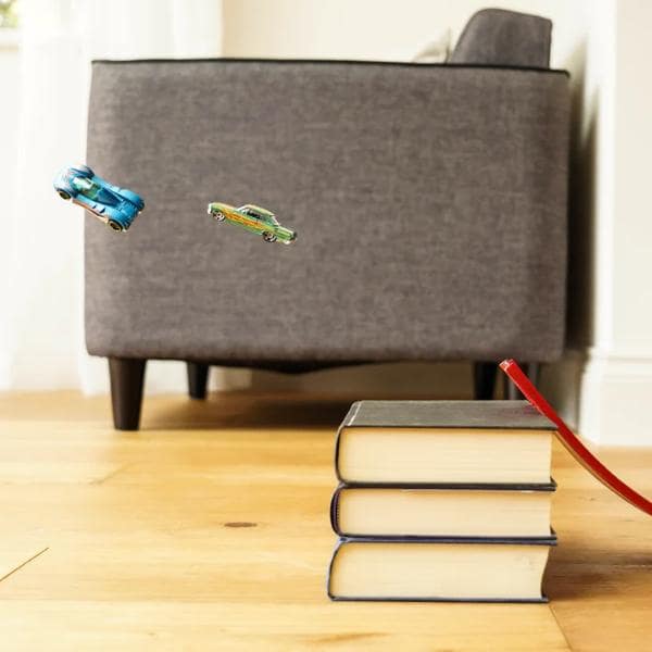 Utiliza los coches de juguete que ya tienes, fíjalo fácilmente a una ventana o puerta, hazlo rodar y empieza a correr, impulsado únicamente por la gravedad, sin necesidad de pilas ni de costosos complementos.