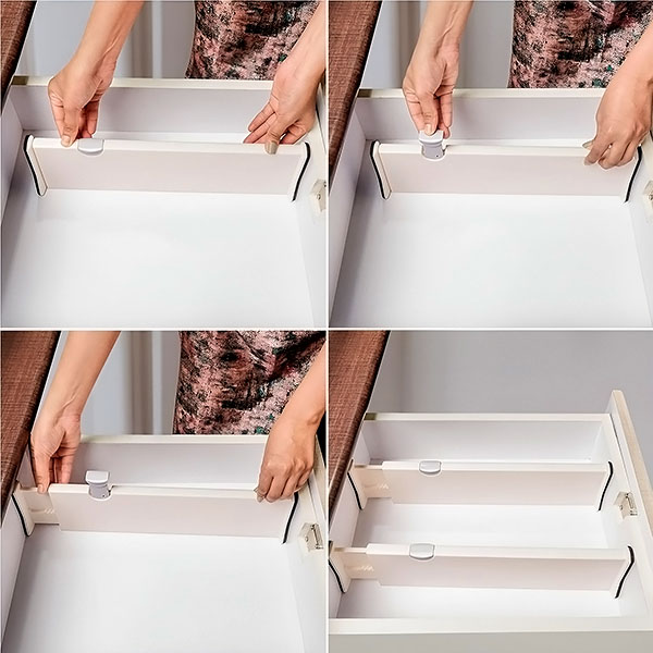 En solo unos segundos podrás transformar tus cajones desordenados. Con la instalación sencilla de “deslizar y hacer clic”, organizar nunca ha sido tan fácil. Simplemente coloca, ajusta y bloquea el separador en su lugar, sin necesidad de herramientas ni adhesivos.