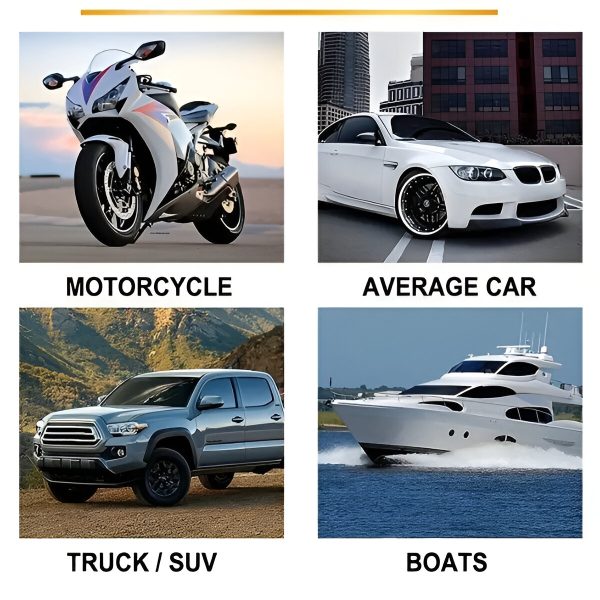 Utiliza CARCOAT en coches, barcos, motocicletas, autocaravanas, cuatrimotos y más. Es seguro para todas las superficies, incluidas pintura, plástico y vidrio.